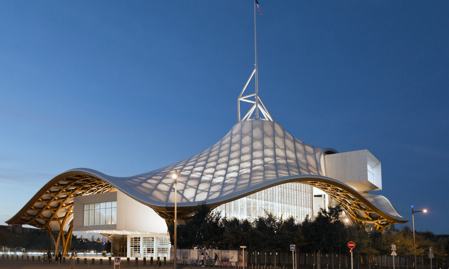 Japanilaisen arkkitehdin Shigeru Ban suunnittelema rakennus on kiinalaista hattua muistuttava betoni- ja puurakenne. Se koostuu kolmesta 80 metriä pitkästä näyttelygalleriasta, jotka on pinottu porrastettuihin riveihin, joihin kuhunkin mahtuu kaksi TGV-junaa vierekkäin.